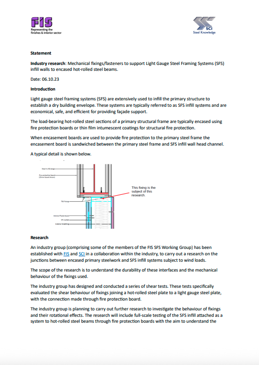 Mechanical fixings/fasteners to support Light Gauge Steel Framing Systems (SFS) infill walls to encased hot-rolled steel beams.
