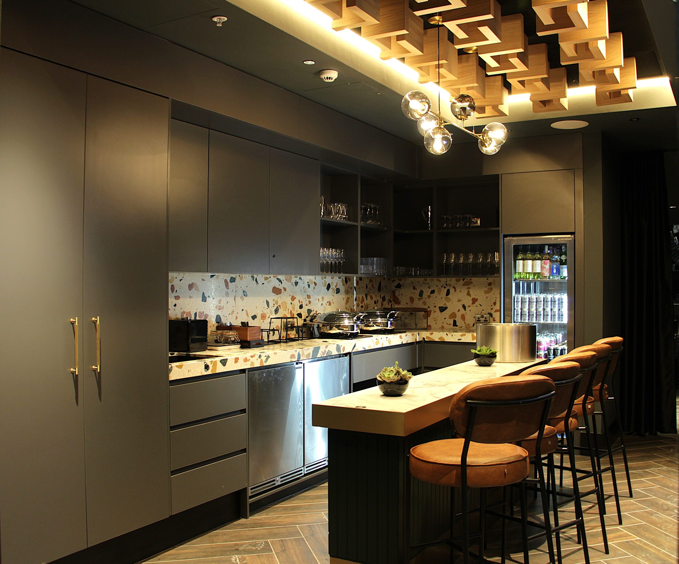 Level 2 contains spectacular lighting features formed by creating specialist vaulted ceilings with curved apertures. These required high levels of precision to reach the aesthetic requirements. The bars needed heavy-duty walls to support the steel framework for bottle displays.