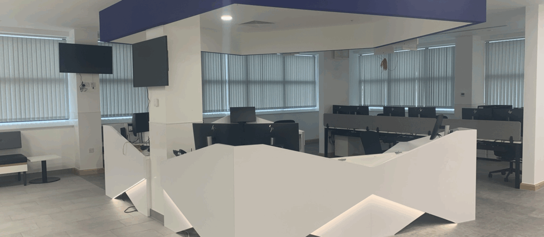 The project involved extensive bespoke joinery, including the manufacture and installation of multiple feature desks. These desks featured Corian-formed curved worktops, with end-user logos precisely machined into the Corian surfaces, highlighting the custom nature of the fit-out.